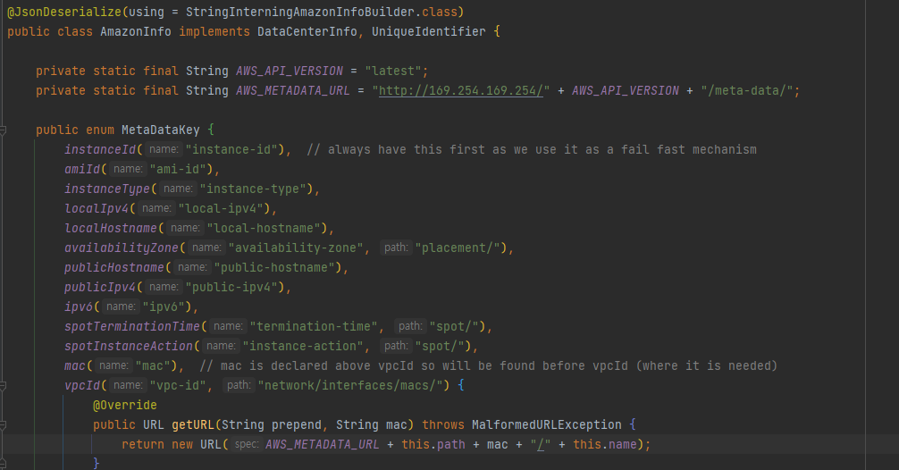 이 클래스가 하는 역할은 단순하다. http://169.254.169.254/{awsVersion}/meta-data/{메타데이터 path}/ ..이하 생략 으로 get요청을 날려서 응답을 받아온다.