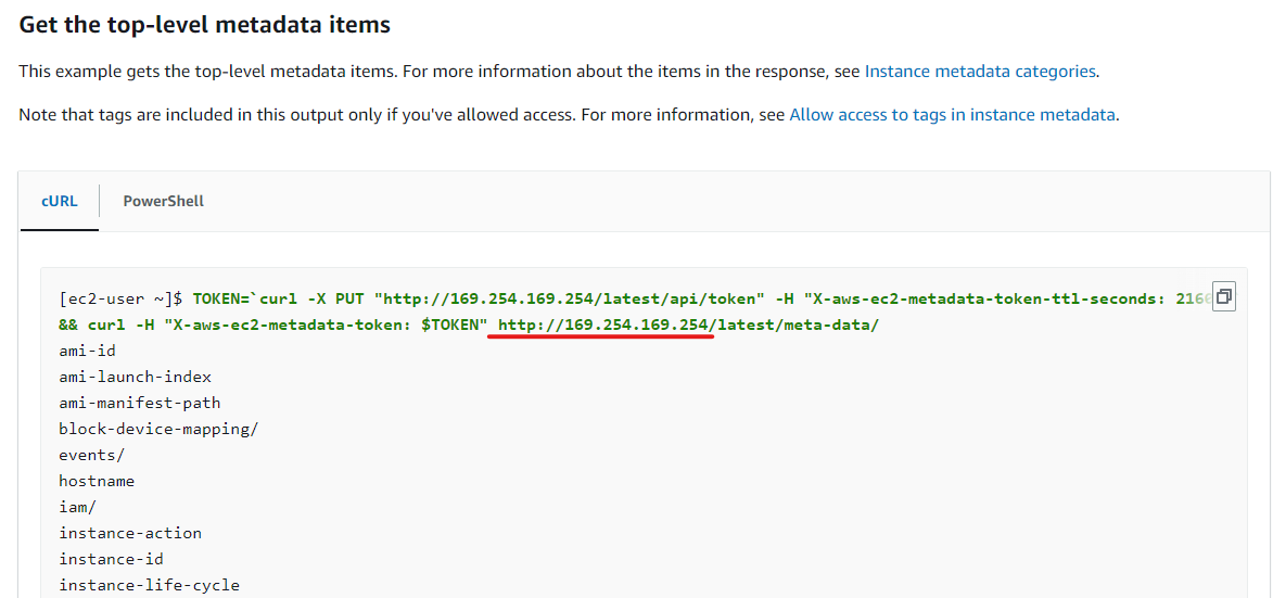 http://169.254.169.254/ 는 AWS에서 제공하는 메타데이터를 가져오는 url이다