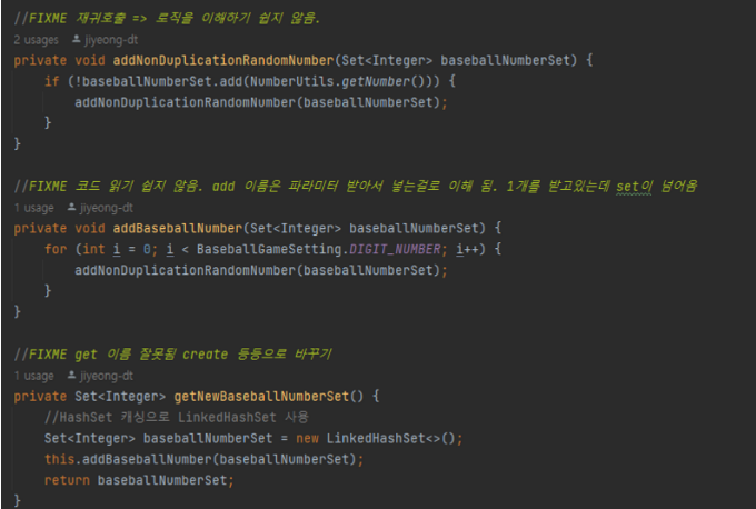 - 메소드 이름도 부적절하다는 평가를 받았다.