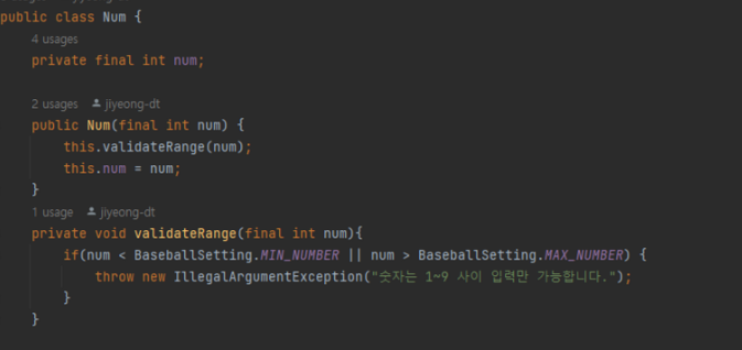 - 원시 타입 포장으로 num (1~9까지의 수)를 검증 하는 책임을 num 클래스에 부여했다.
